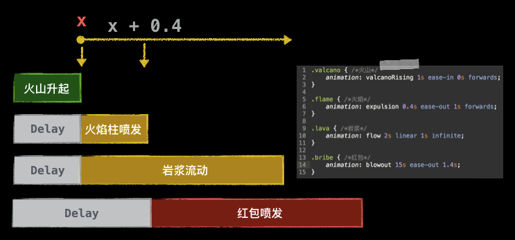 上图演示的是一个红包火山的动画场景(喜欢手淘的同学,应该在去年的双十一看到过这样的动画),在这个动画中我们包括了火山升起(valcaoRising)、火焰柱喷发(expulsion)、岩浆流动(flow)和红包喷发(blowout)。在这个动画中,我们要人工的去计算动画的延迟时间(animation-delay)和持续时间(animation-duration)。比如火山升起,我们花费了1s,火焰柱喷发等火山升起才开始,这样一来,其延迟时间为1s,并且持续了.4s,在此同时岩浆流动的效果也同时发生,也就是说岩浆流动的延迟时间也是1s,而其持续了2s,其实动画进行到1.4s时,火焰柱喷发的动效是已经停止了。除此之外,还有红包喷发的一个动画,而这个动画是在火焰柱喷发结束的时候开始,这样其延迟时间是1.4s,并且持续了15s。其实整个动效花了16.4s。