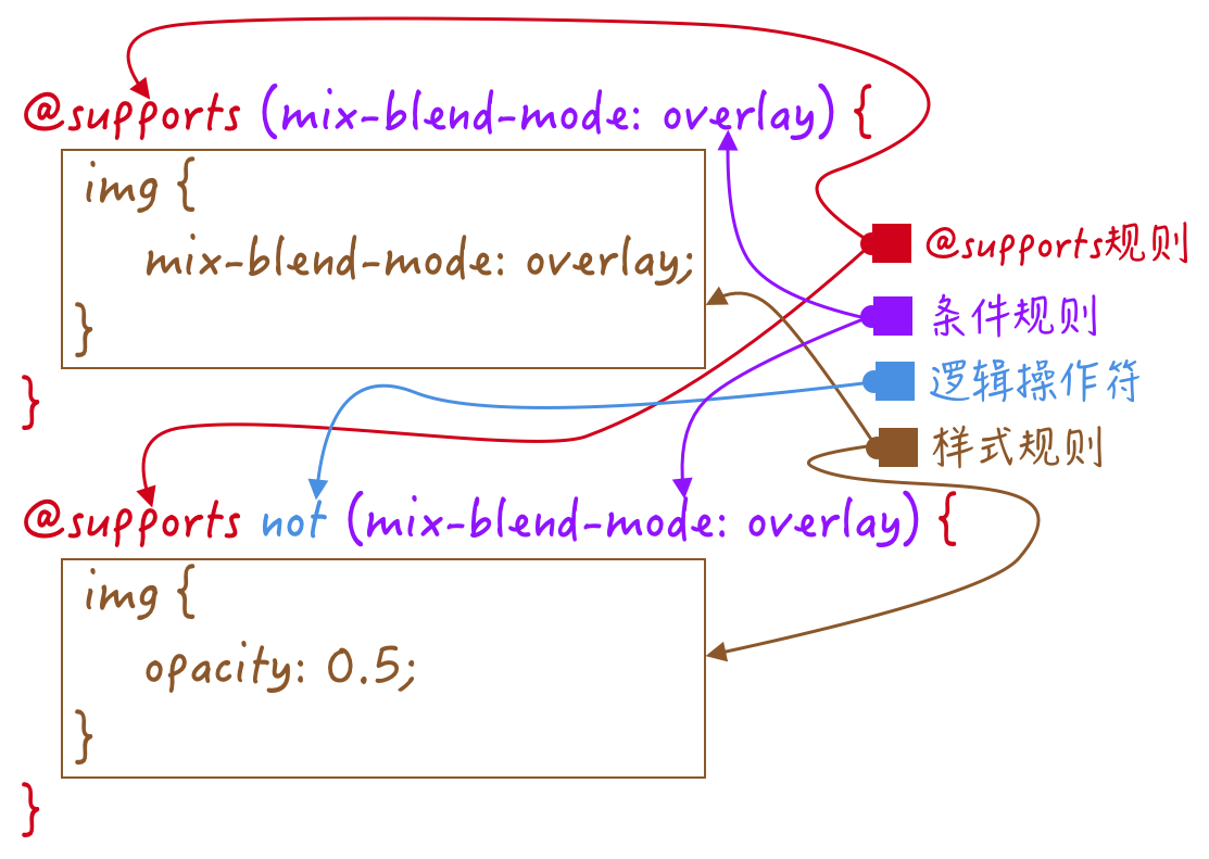 上面的示例代码将会告诉浏览器,如果支持mix-blend-mode:overlay样式规则,将会执行@supports (...) {...}中的CSS: