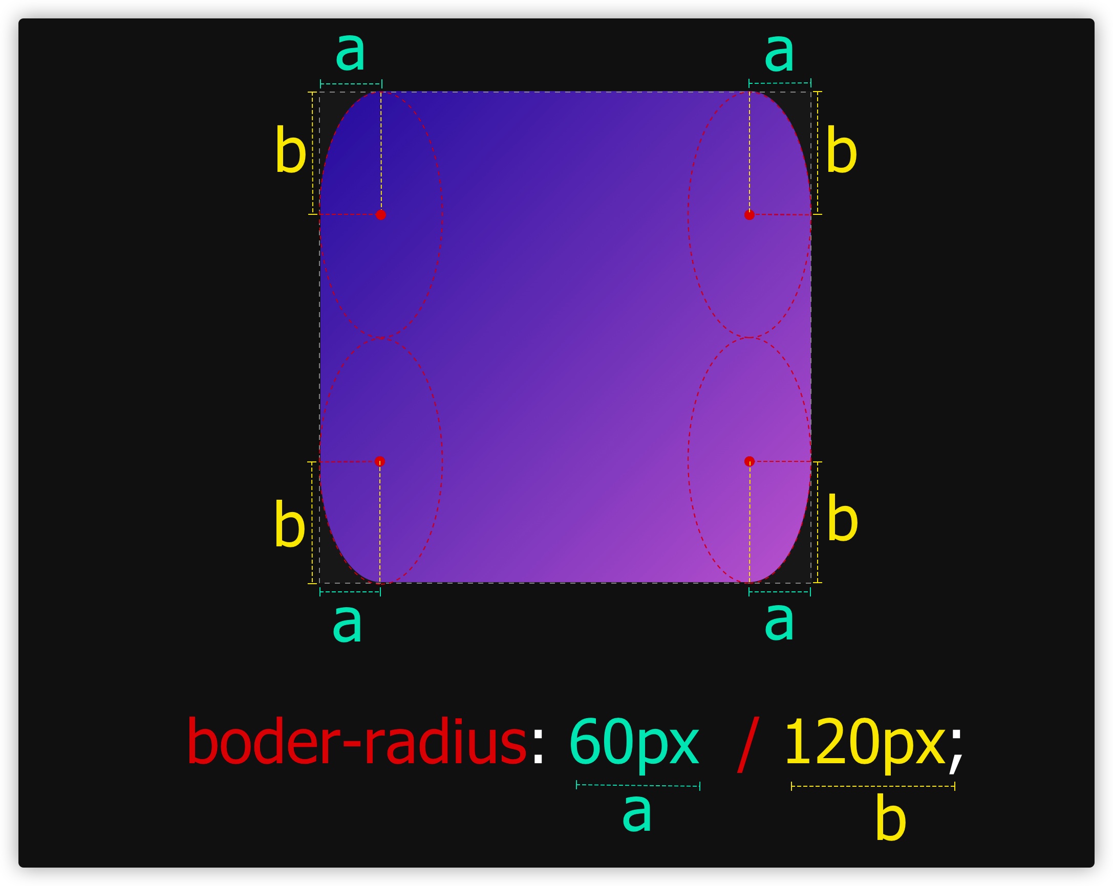 上面这个代码同样表示的是元素所有圆角效果相同,只不过每个圆角的x轴半径为60px,y轴的半径为120px: