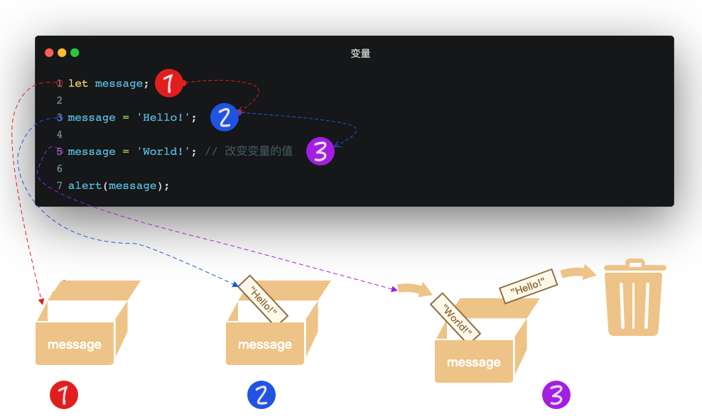 如果你使用过任何编程语言,变量这个词(概念)并不会陌生。在一些命令式编程语言中(比如我们前端熟悉的JavaScript),可以通过变量让我们更好的跟踪某些状态。变量是一种符号,关联着一个特定的值,变量的值能随着时间的推移而改变。变量的好处还在于我们可以把值存储在一个地方,然后在需要的地方调用它或者修改它。这样就不用在程序的不同地方为不同的值添加不同的变量: