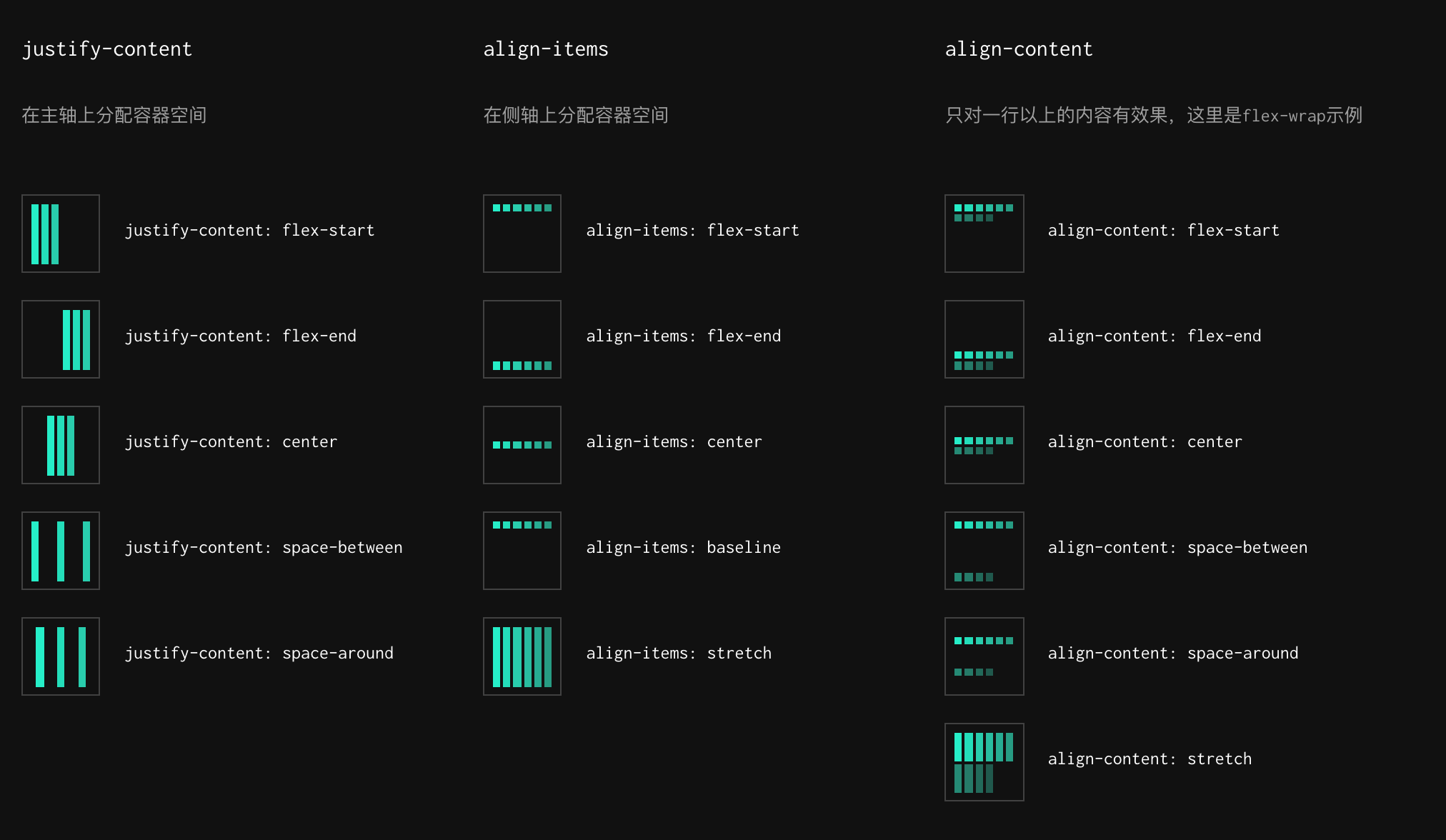 这仅仅是其中的两种情形,如果flex-direction值改变的话,那么主、侧轴的位置也将会得到相应的改变。