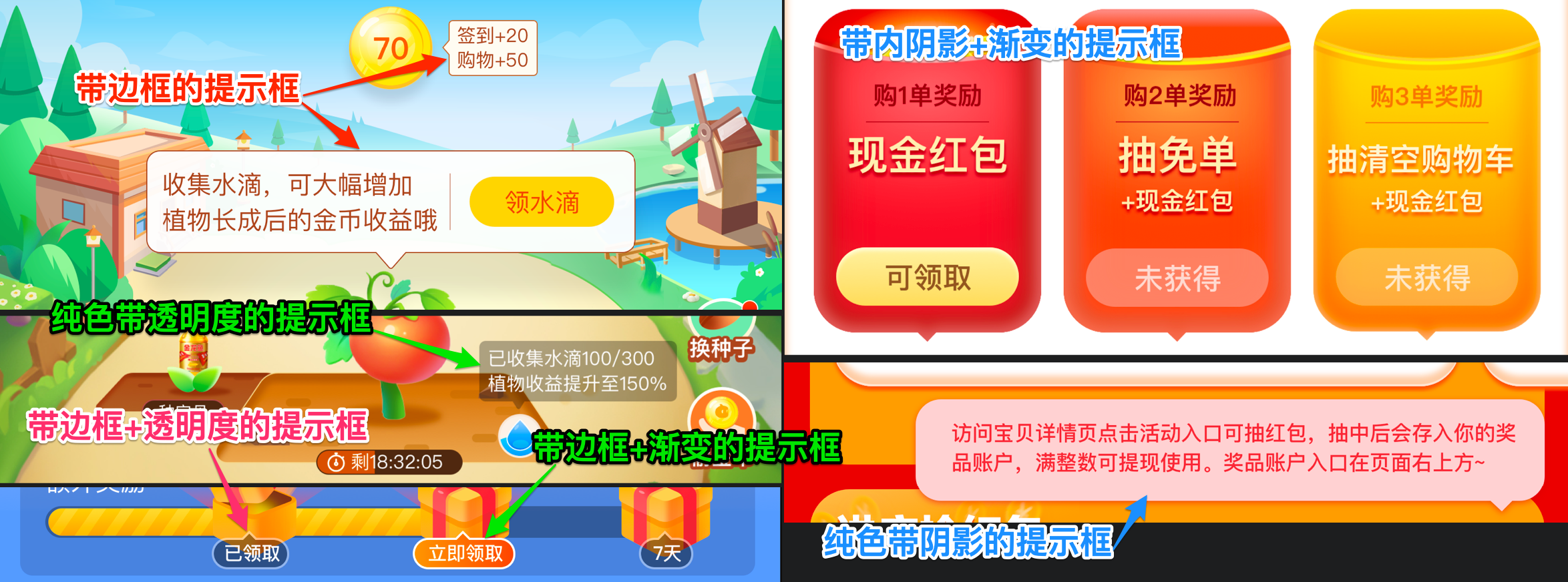 可能还有我未碰到的提示框UI风格。面对这么多的UI风格,对于前端实现上来说是具有一定的挑战性,特别是多种效果组合在一起的。比如说,带有边框+内外阴影+渐变(或透明度)+圆角三角等。基本上组合了上图所提到的各种UI风格。