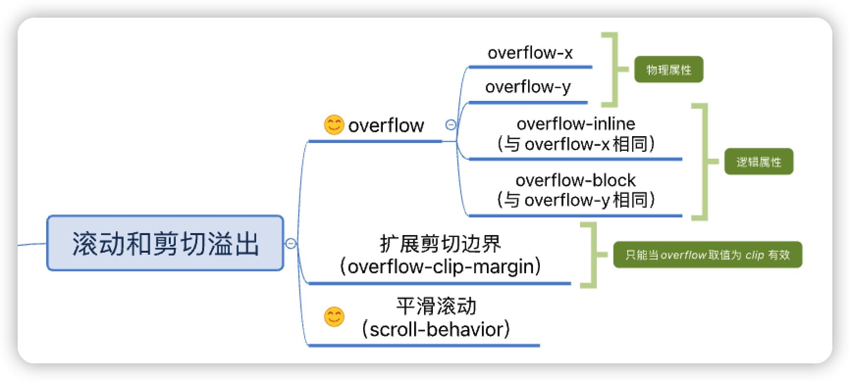 overflow、overflow-x和overflow-y,以及流相关的属性:overflow-block和overflow-inline,它们分别是overflow-y和overflow-x对应的逻辑属性 - 为滚动条保留空间的属性:
