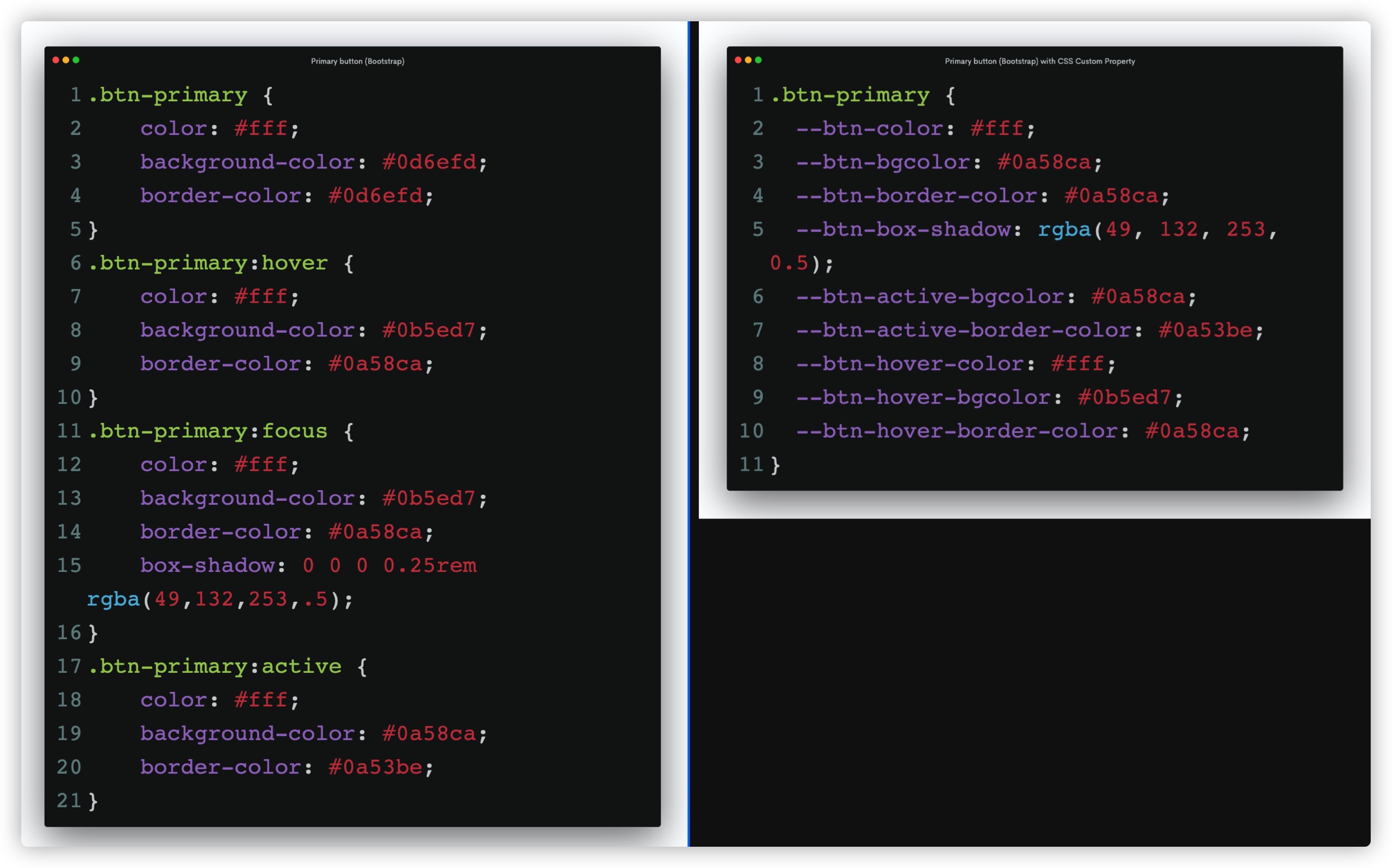 Web组件(或者说UI组件)在Web中是最可见之一,使用CSS自定义属性可以让组件的代码变得更简单。拿Bootstrap的button举例: