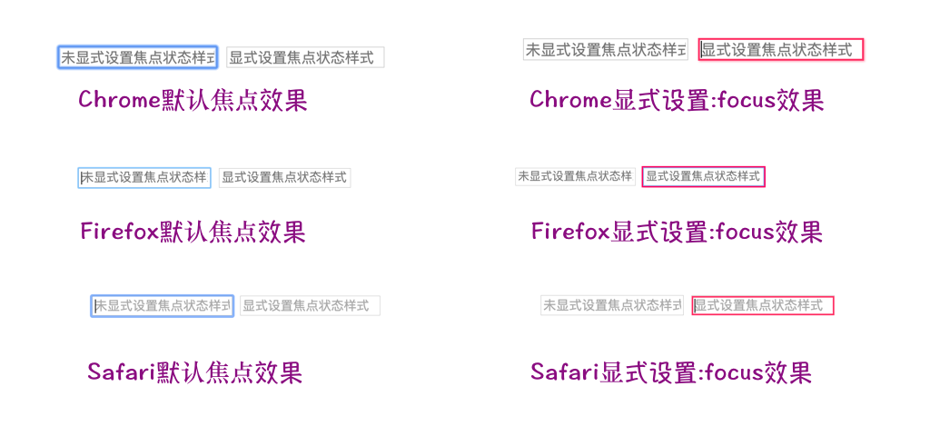 在一个Web页面或Web应用程序中,在任何给定的时间都有一个元素具有焦点。当前聚焦项通用使用聚焦环(outline样式)标示出来,对于该样式取决于浏览器,也取决一起CSSer给可聚焦元素定义的样式。如下图所示: