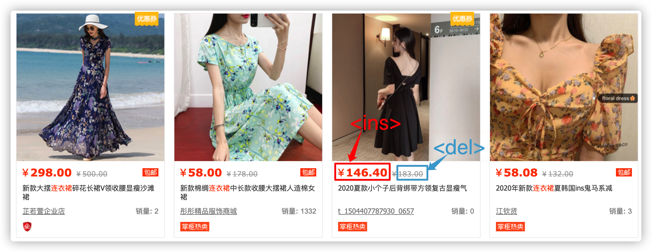 针对这样的场景,使用<del>和<ins>标签就非常贴合使用场景,或者说更符合语义化。