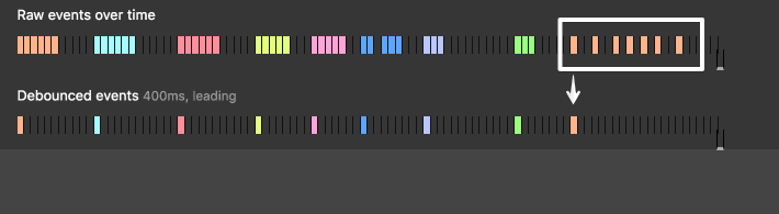 你可以看到连续快速的事件是如何被一个 debounce 事件替代的。但是如果事件触发的时间间隔过长,debounce 则不会生效。