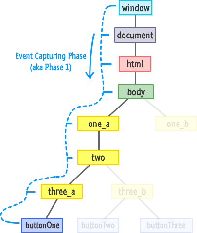 从根开始,事件从上一级一级往下,并在触发事件的元素buttonOne(事件目标)处停止: