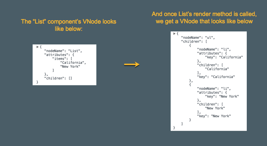 h函数使用 JSX 的返回值作为参数,创建了一个叫VNode的东西(React 的createElement创建 ReactElement)。一个 Preact 的VNode(或者是 React 的 Element)只是一个 JS 对象,代表着一个 DOM 结点,其中包含了它的属性和子结点。