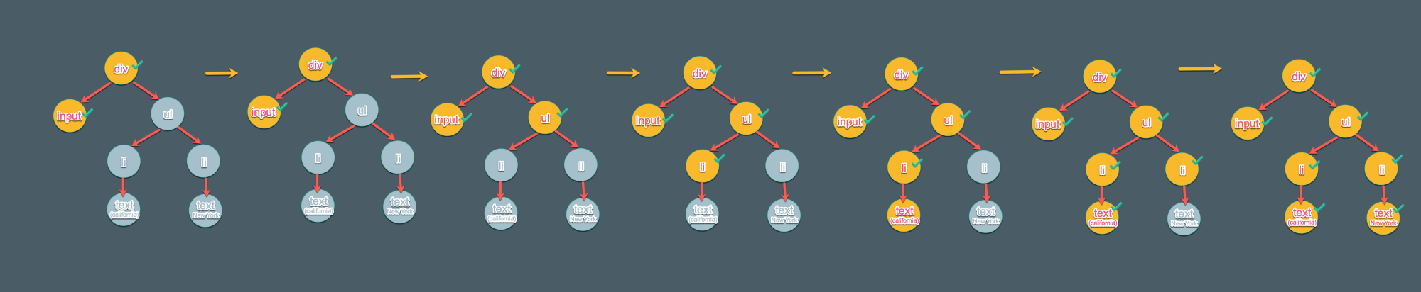在这一步中,我们会处理子结点。由于 input 拥有父结点 div,我们就把 input 作为子结点添加到 div 中。接着 input 的处理流程结束,继续处理 List( div的第二个子结点)。