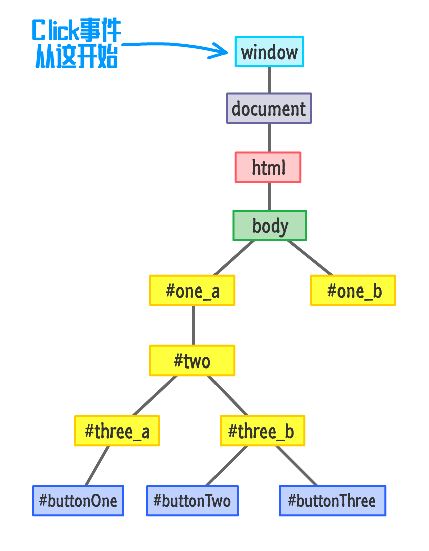click事件从文档根(window)开始,然后按照DOM树的路径一级一级往下寻找,直到触发click事件的butttOne元素(也称为事件目标)停止: