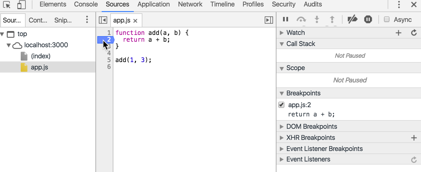 设置断点后,返回此页面,并正常地使用它,直到达到某个断点。这将暂停页面上的所有 JavaScript,焦点转向“DevTools Sources”面板,并突出显示断点。现在,您可以有选择性地执行代码并逐步检查其数据。