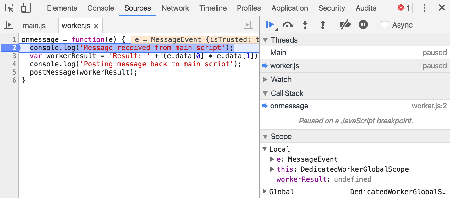 并且您还在 worker.js 中设置了一个在工作线程收到消息时触发的断点: