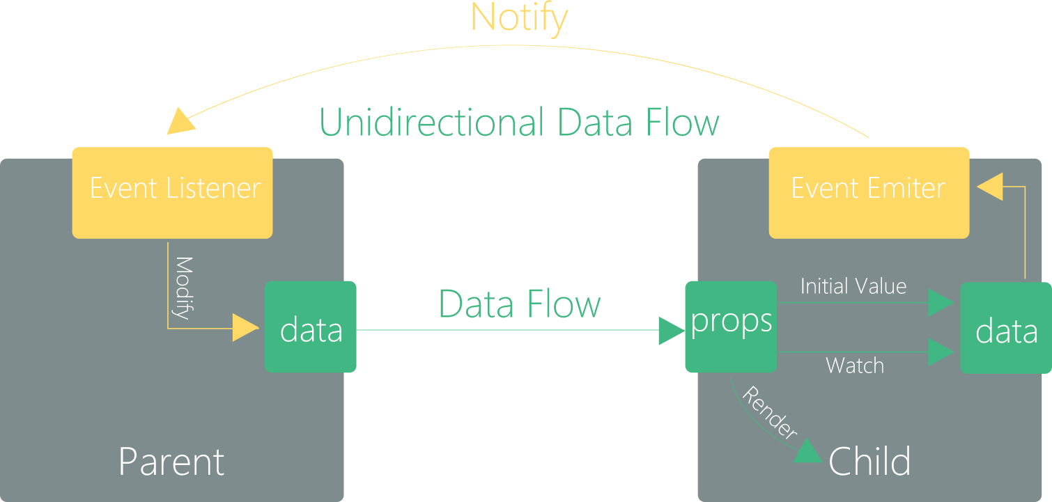 在Vue的官方文档中提到,在Vue中,父子组件的关系总结为:prop向下传递,事件向上传递。父组件通过prop给子组件下发数据,子组件通过事件给父组件发送消息。如下图所示:
