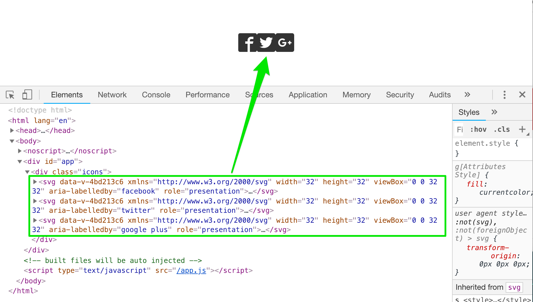 为了更好的演示官网提供的示例,将在components目录中新创建一个.vue文件,将引用我们创建的Facebook、Twitter和GooglePlus组件。该文件名暂时取名为VueOfficialSvgIcons.vue,接下来我们就可以这样使用这几个SVG图标: