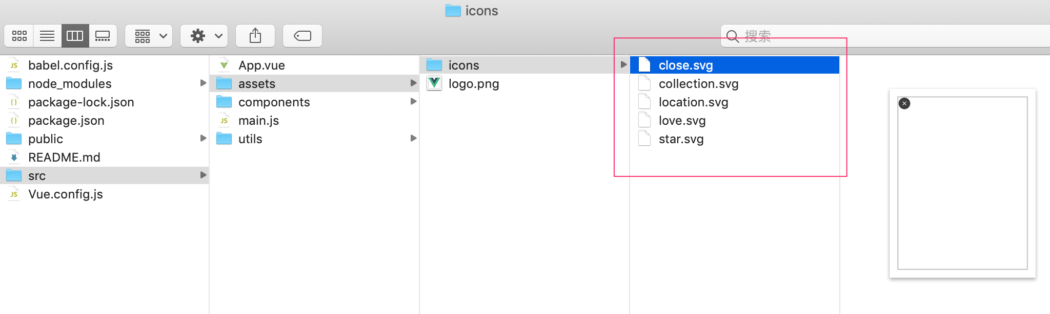 采用默认的模板来构建了一个svg-icon-app项目。我们先跟着官网提供的思路来一步一步往下走,在components目录下创建一个新的目录icons。并将相应的SVG图标以一种标准化的方式命名,比如: