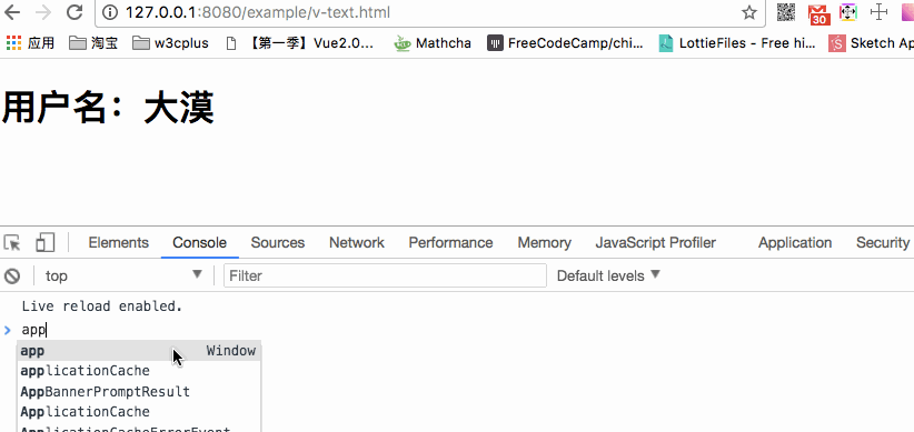 从效果图上可以看出来,v-text和{{}}起到的效果是一样的。同样的,动态修改对象name的值时,渲染的结果也会有对应的变化: